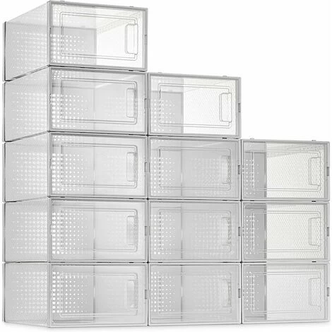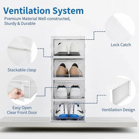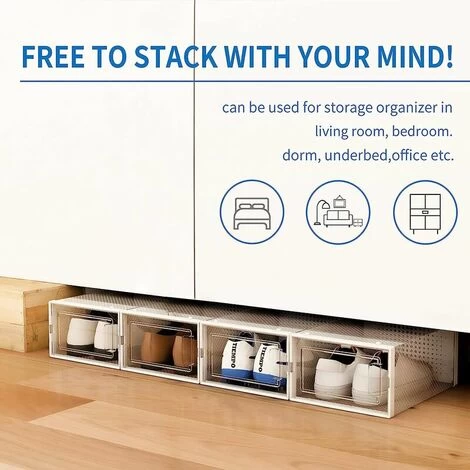 Durchsichtiges stapelbares Design, um Ihren Platz zu maximieren. Stapeln Sie sie oder verwenden Sie sie nebeneinander, damit Ihre Schuhe organisiert und leicht zu finden sind. Jeder Mülleimer misst ca.