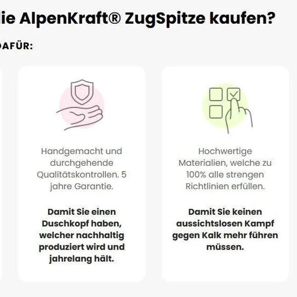 Aktion AlpenKraft ZugSpitze Duschkopf Premium ZugSpitze — Der beste wassersparende Duschkopf von AlpenKraft® MADE IN GERMANY WEIL ALLES WAS IN DEUTSCHLAND PRODUZIERT WIRD, FÜR DIE EWIGKEIT GEBAUT WURDE Euro 5 Jahre Garantie MIT EDELSTAHL-RINGEN ENTSPRICHT ALLEN GESETZLICHEN KRITERIEN GEFÜL
