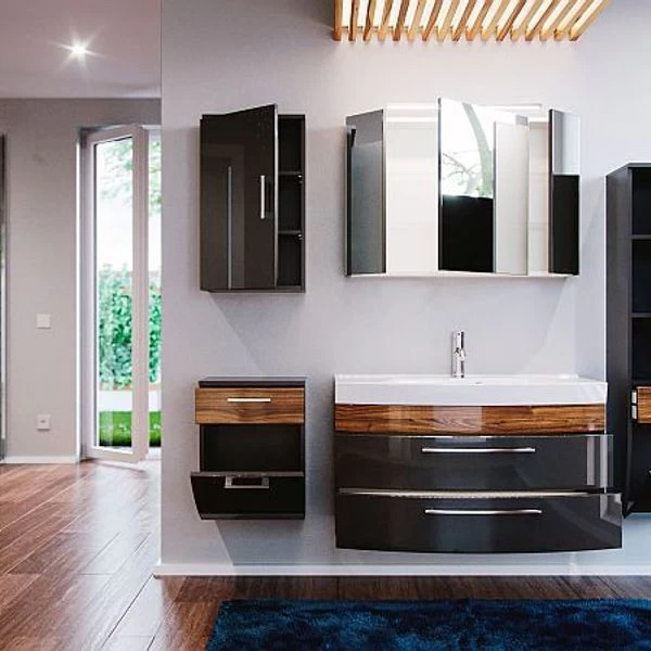 Badmöbel – Set Rima – 5-teilig Ein exqisites Badmöbel-Set für gehobene Einrichtungsträume. Das 5-teilige Posseik Badmöbel-Set Rima in der Ausführung Anthrazit-Walnuss lässt keine Wünsche offen und avanciert mit einer attraktiven Formgebung zu einem wunderschönen Blickfang in Ihrem Badezimmer. Währen