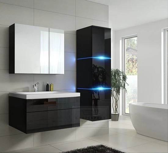 Badmöbel-Set Lux 1 NEW Neuheit, nur bei uns erhältlich, inkl. großes Waschbecken aus Keramik Farbe: -Front in Schwarz Hochglanz -Korpus in Schwarz Matt Eigenschaften: MDF-Fronten Grifflos, alle Türen und Klappe öffnen grifflos durch Antippen. Türanschlag links rechts montierbar Hängeschrank mit Glas