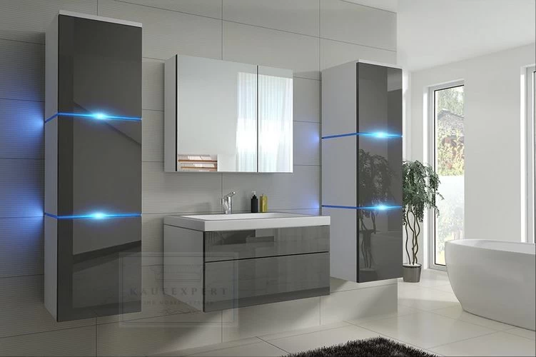 Badmöbel-Set Lux NEW Grau Hochglanz/ Weiß Keramik Waschbecken Badezimmer Led