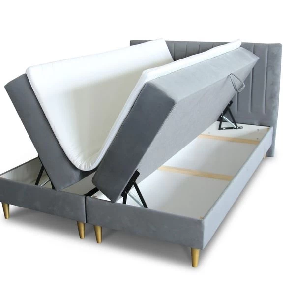 Boxspringbett Gold Das moderne Bett GOLD ist mit einem praktischen Bettkasten ausgestattet. So haben Sie die Möglichkeit durch seitliches Hochklappen des oberen Matratzenteils diesen dazugewonnenen Stauraum zum Verstauen von Bettwäsche, Winter- oder Sommerdecken, Kissen und anderen Dingen zu nutzen.