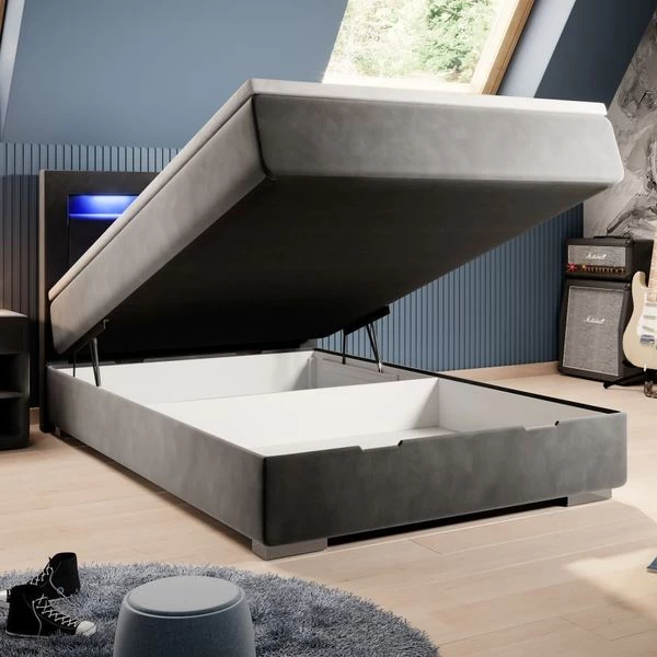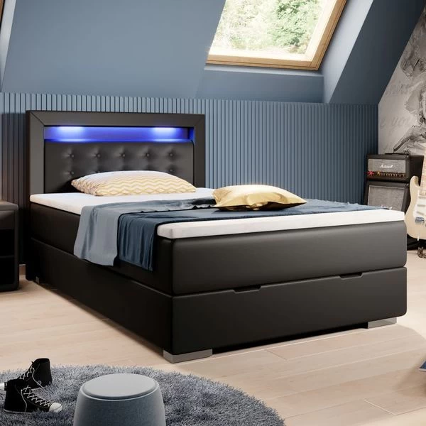 Modernes Boxspringbett Mila 120×200 cm mit Bettkasten und LED Das moderne Boxspringbett Mila vereint stylische Optik mit perfekten Komfort und eignet sich mit der Größe 120×200 cm vor allem für Singles, Senioren und Jugendliche. Das Einzelbett verfügt über eine hochwertige Federkern-Matratze und ein
