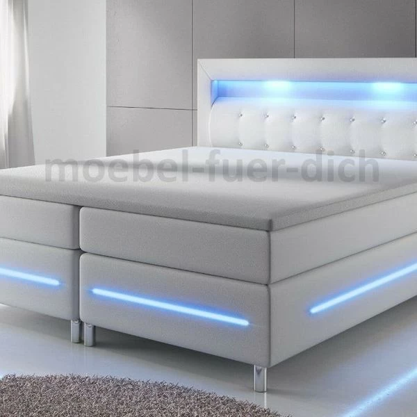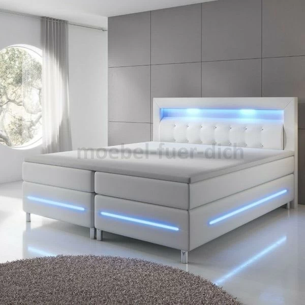 180, 160 oder 140×200 cm, Kunstleder – Boxspringbett Salerno mit LED in Seiten und Kopfteil in Kunstleder schwarz oder weiß Die in die Seitenteile und den Fußteil integrierten LED Leisten verleihen dem Boxspringbett Salerno ein sehr attraktives modernes Aussehen. Dieser Eindruck wird noch verstärkt