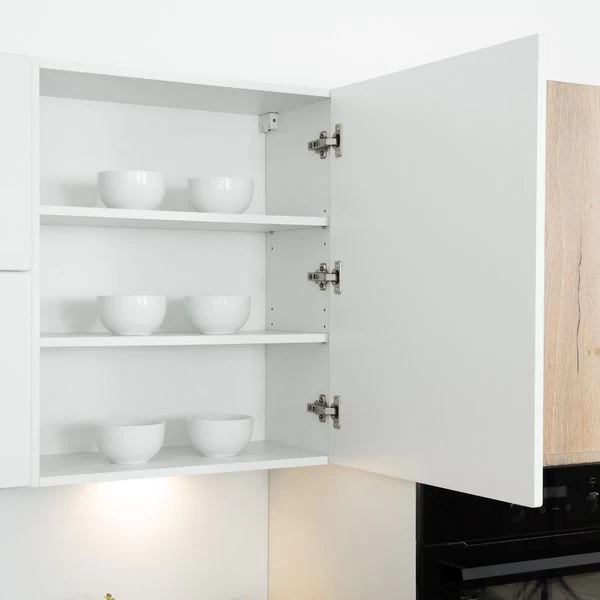 Grifflose Eckküche Einbauküche in L-Form ZOYA 290×170 cm, 9-tlg, mit 7 Schubladen. Die moderne Küchenkollektion Zoya mit den grifflosen Fronten entspricht den aktuellen Trends in Küchendesign. Für die Fronten stehen drei aktuelle Trendfarben zur Auswahl: weiß matt, hellgrau matt oder eiche halifax n