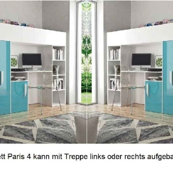 Hochbett 200×90 PARIS 4 hochglanz Maße : Gesamtbreite – 247 Höhe – 165 Gesamttiefe – 120 Liegefläche: 200 x 90cm Farbe : Korpus: weiß matt Fronten hochglanz zur Auswahl: weiß – weiß türkis rosa grau schwarz Griffe: weiß – weiß türkis rosa grau schwarz Beschreibung : ein platzsparrendes multifunktion