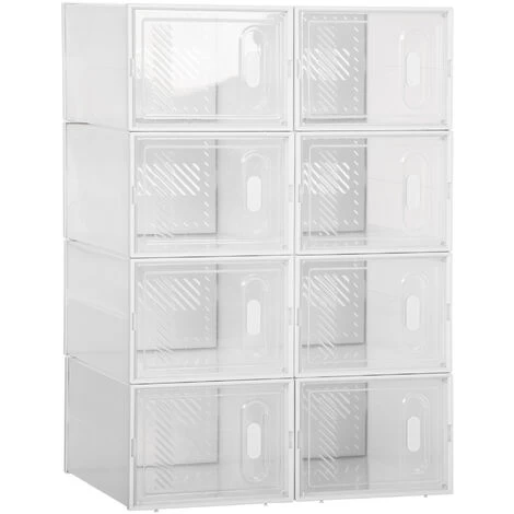 Dieser moderne Schuhschrank von HOMCOM ist jedem Schuhregal einen Schritt voraus! Bestehend aus 8 Würfelmodulen, lässt er sich nach Belieben zusammensetzen und optimal Ihrem Interieur anpassen. Das robuste Kunststoffgehäuse ist ausgesprochen langlebig und zudem mit praktischen Belüftungsöffnungen ausgestattet. Dank des transparenten Materials behalten Sie stets den Überblick über Ihre Kollektion. Natürlich können Sie den Schrank auch für Spielzeug, Bücher, Wäsche u. v. m. nutzen.