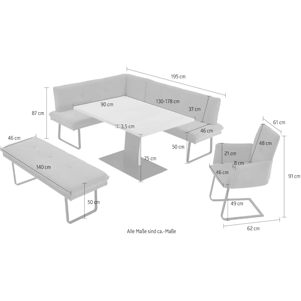 | Wissenswertes | Set besteht aus 6 Teilen. 1 Polsterbank, 2 Stühle, 2 Armlehnenstühle und einem Funktionstisch.Der Tisch ist immer passend zur Bank, Bei der Bank 172 cm = der Tisch 160cm und bei Bank 195 = Tisch 180cm. |