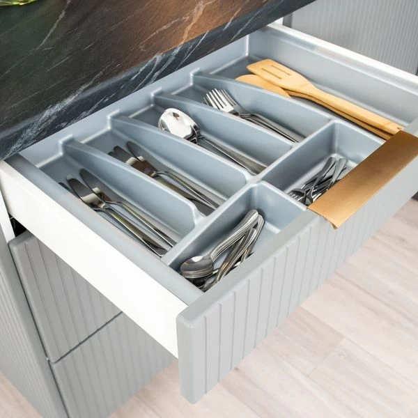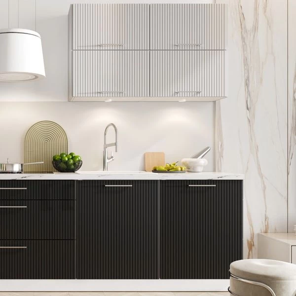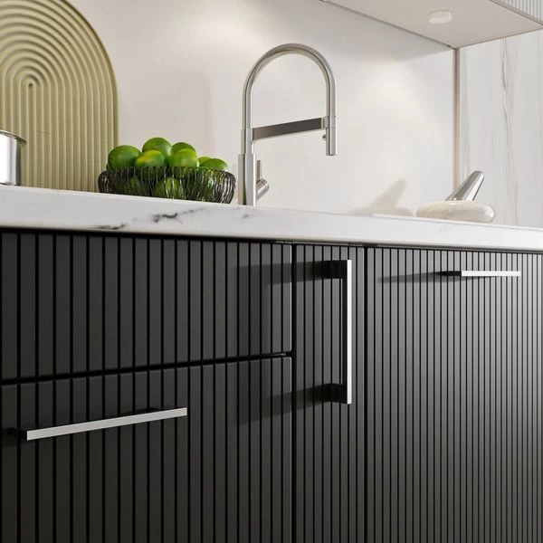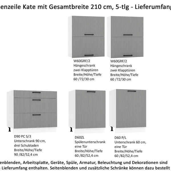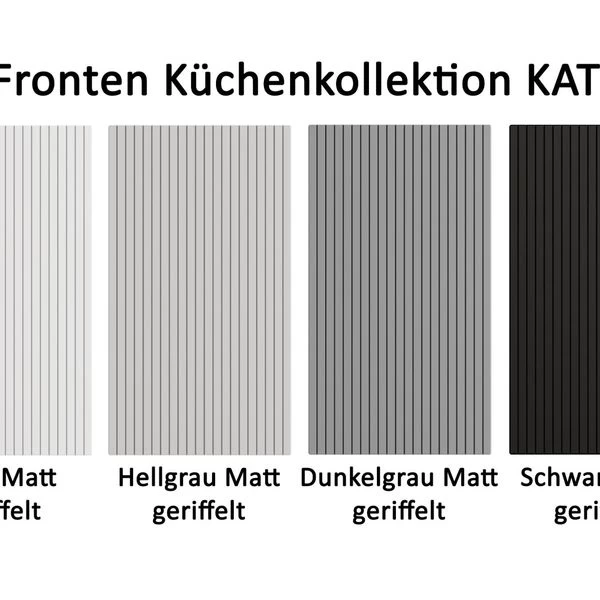 Einbauküche Küchenzeile Kate 210 cm, 5-tlg, Fronten geriffelt, weiß, grau, schwarz Durch die vertikal geriffelte Struktur der Fronten verbindet die Küchenkollektion Kate den modernen Minimalismus mit der klassischen Eleganz. Die geriffelten Küchenfronten können wahlweise in Weiß, in zwei Grautönen o