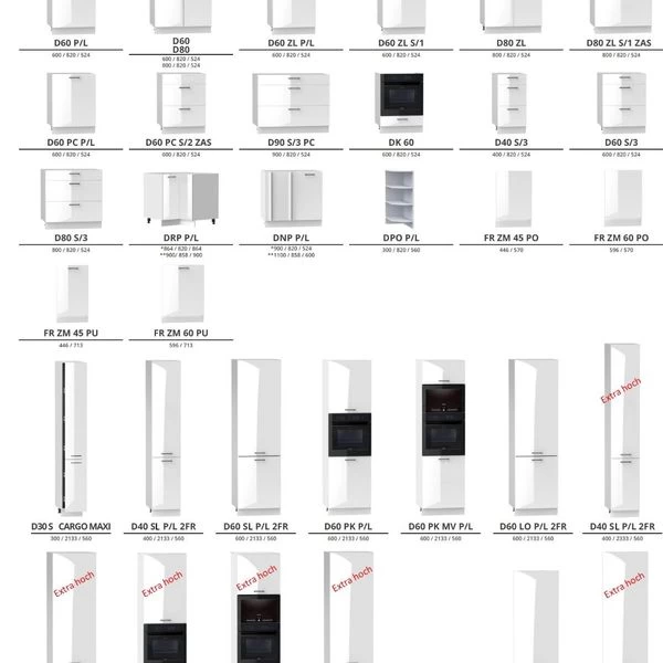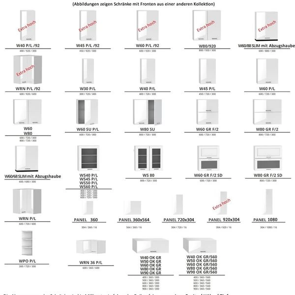 | Fronten Oben | Weiß Matt, Hellgrau Matt, Dunkelgrau Matt, Schwarz Matt, Weiß Matt, Hellgrau Matt, Dunkelgrau Matt, Schwarz Matt, Standard Edelstahl, Standard Schwarz |