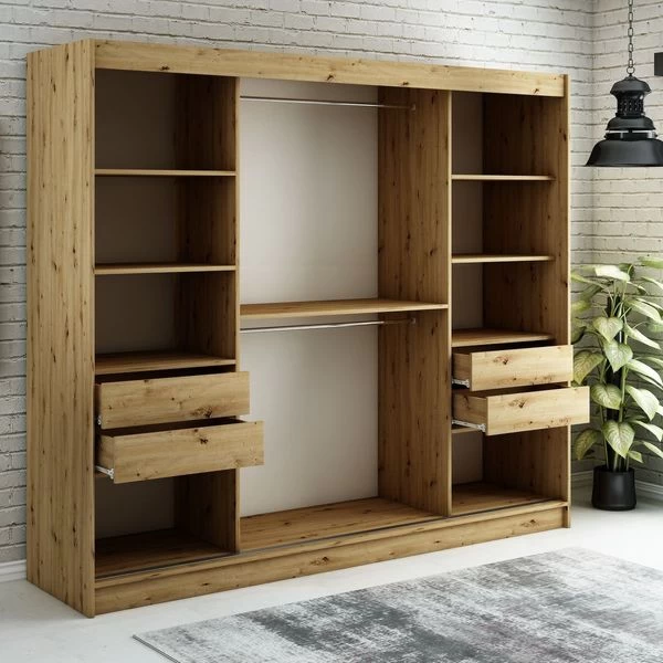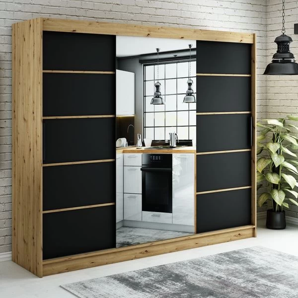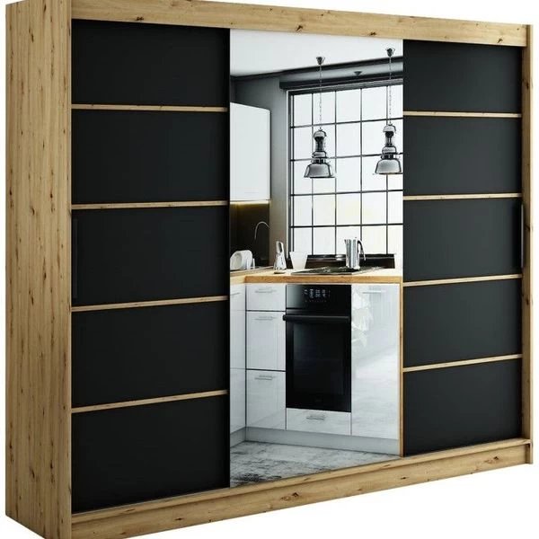 Kleiderschrank LETO V2 Maße: Breite: 250 cm Höhe: 200 cm Tiefe: 62 cm Merkmale: Korpus: 16 mm starke laminierte Platte in Artisan Eiche gefärbt Vorderseite: 16 mm starke laminierte Platte in mattschwarzer Farbe Polierter Spiegel auf der Vorderseite Dekorative Kunststoffstreifen zur Selbstmontage Met