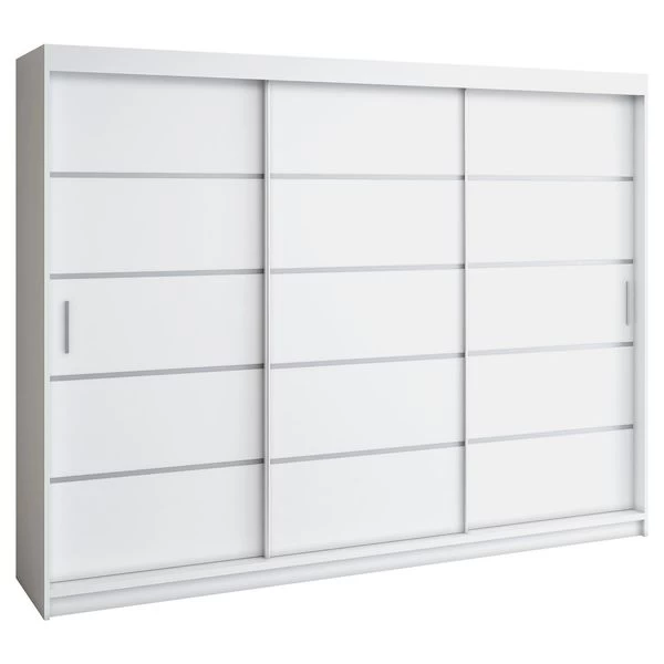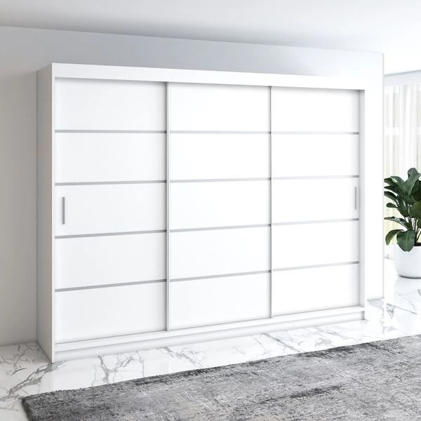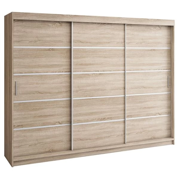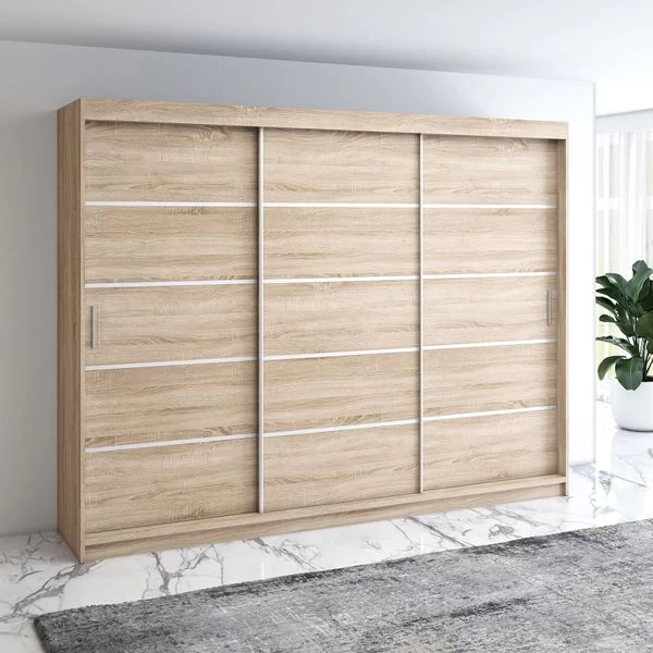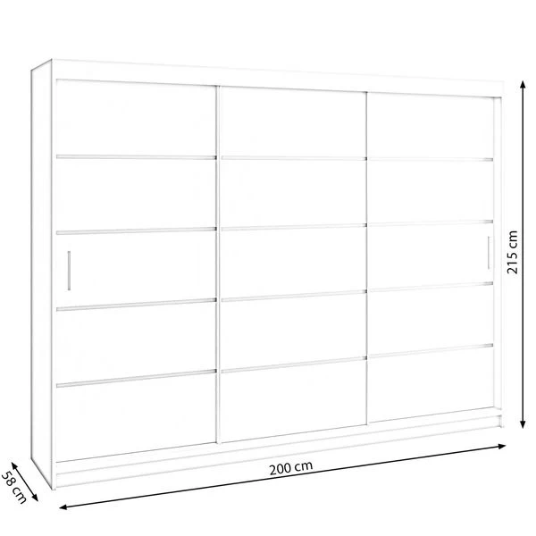 Kleiderschrank ELEX Spezifikation Farbe: schwarz, eiche sonoma, weiß Regale und 2x Stange zum Aufbewahren von Kleidung und Schuhen 4x Schubladen bieten zusätzlichen Stauraum aus 16 mm laminierter Platte mit 3x Schiebetüren Kanten mit ABS 0,5 mm bedeckt, was ihre Haltbarkeit erheblich erhöht Abmessun
