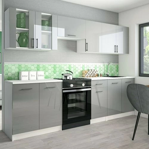 KÜCHE 260cm Küchenzeile Küchenblock MODERN Einbauküche Grau Hochglanz