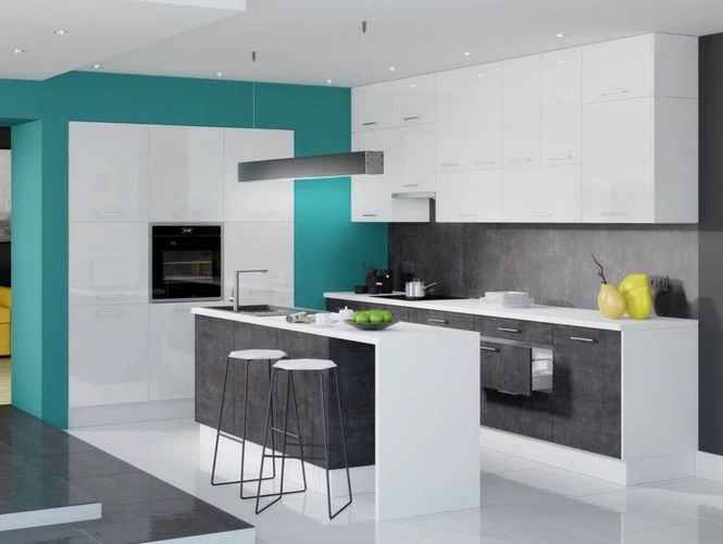 Küche Küchenzeile Weiß Glanz / Grau Beton Küchenblock Individuell Stellbar