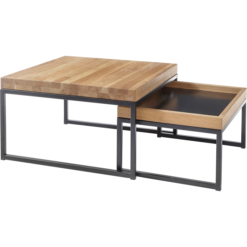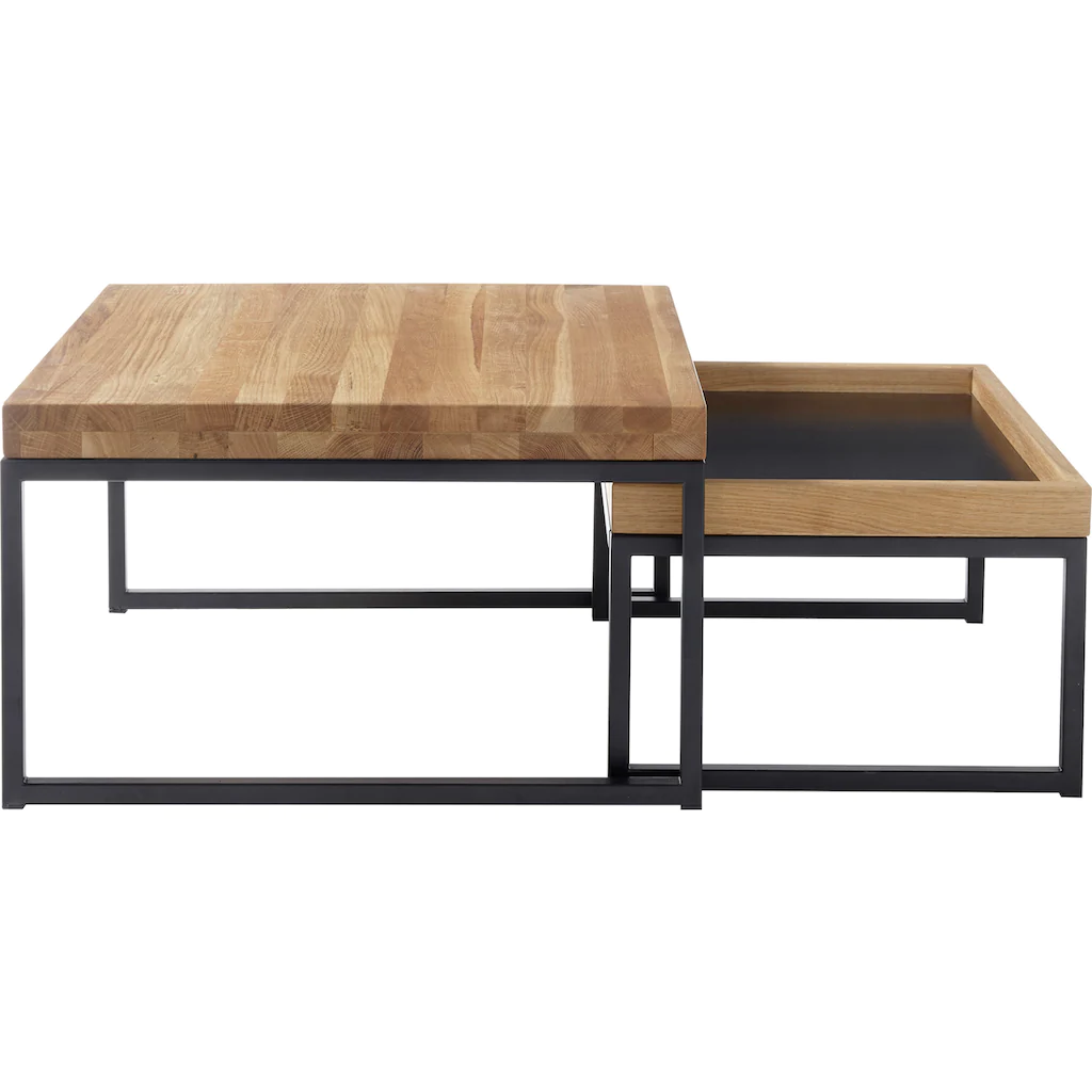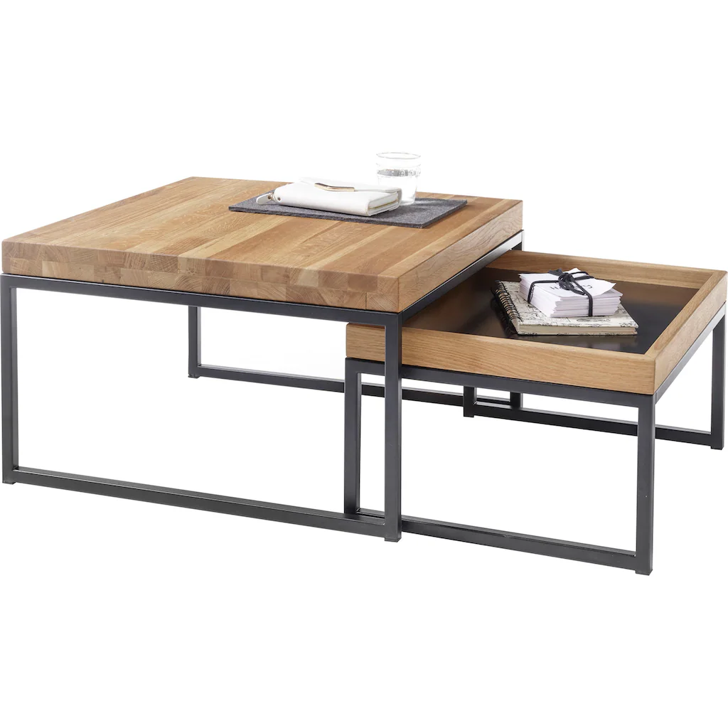 | Wissenswertes | Couchtisch 2er-Set in Asteiche Massiv geöltMetallgestell schwarzTisch 1 groß BxHxT 65x38x65 cmTisch 2 klein BxHxT 57x30x45 cmTablett in MDF bereits montiert |