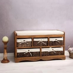 Sie möchten den Platz in Ihrer Wohnung optimal nutzen? Dann begeistert Sie dieses Möbelstück. Die Kombination aus Kommode und Sitzbank ist ein Highlight, das Ihrem Zuhause mehr Gemütlichkeit verleiht. Dank seiner edlen Farbgestaltung in Braun harmoniert das Modell mit jedem beliebigen Einrichtungsstil. Ein besonderes Highlight ist der Shabby Look: Er verleiht der Kommode einen nostalgischen, einzigartigen Charme. Durch das passgenaue Sitzkissen profitieren Sie zudem von einem erstklassigen Komfort. Ob beim Anziehen der Schuhe oder einfach so zwischendurch – die gemütliche Bank verspricht maximale Entspannung. Freuen Sie sich außerdem über den großzügigen Stauraum, den Ihnen die fünf Schubladen bieten. Wo Sie die Sitz-Kommode aufstellen, ist reine Geschmackssache – sie fällt in jedem Raum positiv auf.