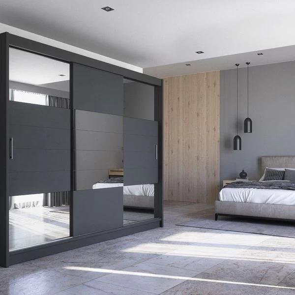 Kleiderschrank : ARUBA 2 Der Kleiderschrank ARUBA 2 250 cm ist eine Neuheit in unserer Firma. Der Kleiderschrank hat drei Schiebetüren und die bequeme Griffe. Der Kleiderschrank hat eine Kleiderstange und die Einlegeboden. Funktionales Interieur, stabile Konstruktion, Graphit Spiegel, sichere Schieb