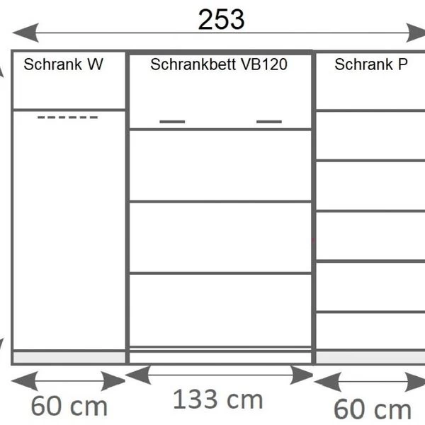 Schrankbett vertikal VB 90 120 140 x 200 mit 2 Schränken Zum Angebot gehören: 1. Schrankbett VB 90 120 140 vertikal 2. Schrank W 1-türig 3. Schrank P 1-türig Maße : Gesamtbreite: 223 cm 253 cm 273 cm Gesamthöhe: 224 cm Tiefe: 41 cm 234 cm Liegefläche: 200 x 90 120 140 cm Produktbeschreibung : 1. Sch