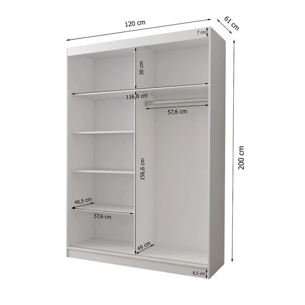 120 cm x 200 cm x 61 cm – Schrank NEomi 05 Abmessungen: Breite: 120 cm, Höhe: 200 cm, Tiefe: 61 cm Details: Kleiderstange und Einlegeböden, hochwertige Laminatplatte 16 mm, ABS Kante, mit Zierleisten, mit Spiegel. Die dekorative Leisten sind eine Option. Sie können diese bei der Montage des Kleiders