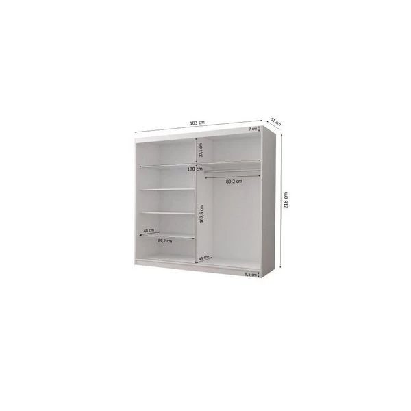 183 cm x 218 cm x 61 cm – Wohnzimmer Jugendzimmer Schlafzimmer Polstermöbel Schränke Schwebetürenschrank BELLA 03 Abmessungen: Breite: 183 cm, Höhe: 218 cm, Tiefe: 61 cm Details: Kleiderstange und Einlegeböden, hochwertige Laminatplatte 16 mm, ABS Kante, Aluminium – Führungen, Spiegel aus Front. Die