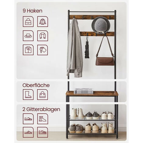 VASAGLE Garderobenständer, Garderobenständer, Flurschuhregal Und Bank Mit Ablagen, Flurbaum Mit Haken, Stahl Matt, Geste