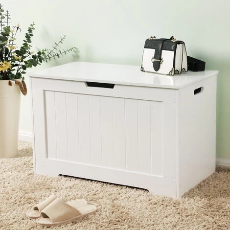 Schaffen Sie zusätzlichen Stauraum und eine Sitzgelegenheit gleichzeitig. Die große Aufbewahrungstruhe besteht aus robusten MDF-Platten. Damit können Sie alle herumliegenden Gegenstände an einem Platz unterbringen. Die Aufbewahrungsbank kann auch als Schuhbank oder Bettbank verwendet werden. Die max. Belastbarkeit beträgt 180 kg. Das geschmackvolle Weiß passt zu fast allem, völlig egal, ob Sie die Bank im Eingangsbereich, im Wohnzimmer oder im Schlafzimmer abstellen. Die speziell gestalteten Sicherheitsscharniere vermeiden ein plötzliches Schließes des Deckels und schützen Sie und Ihre Familie vor Unfällen.